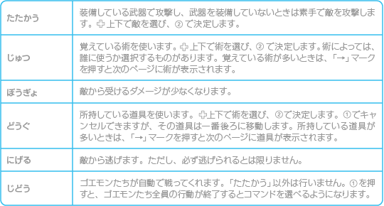 を押すたびに1つ前のコマンド入力待ちに戻ります。敵と味方、全員の行動が終わると、再びコマンドを選びます。敵から逃げるか、敵か味方が全滅すると戦闘が終了します。