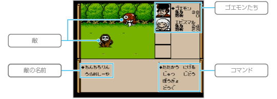 マップ画面を移動したり、屋敷や洞窟のなかを歩いていると、敵が出現して戦闘が始まることがあります。すべての敵を倒すと勝利となり、経験値、こばんなどが手に入ります。