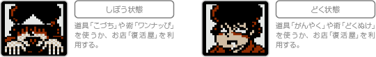 戦闘中にキャラクターの体力が0になると「しぼう状態」となり、操作不能になります。敵の攻撃によって「どく状態」になると、探索画面を移動するだけで体力が1ずつ減っていきます。それぞれ以下の方法で治せます。