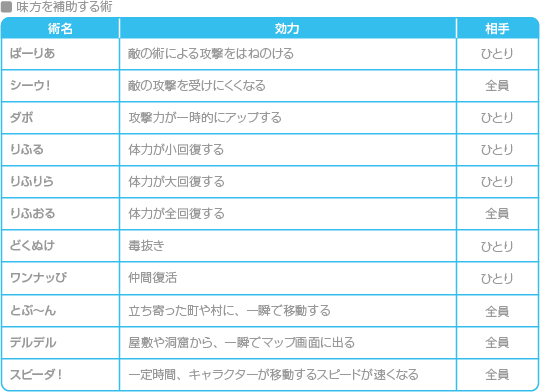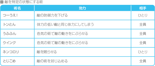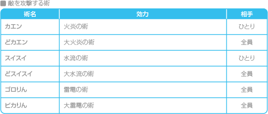 敵を攻撃したり、仲間を回復させるなど、術によってさまざまな効果があります。位が上がると新しい術を覚えることがあります。