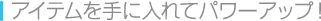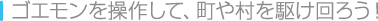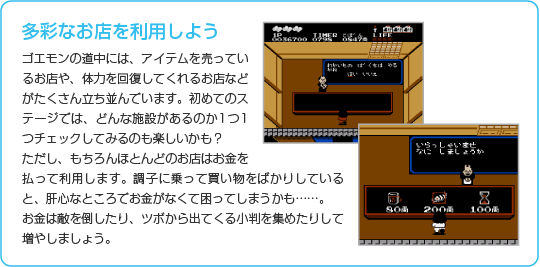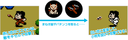 | たくさんの種類のアイテムが登場するのも、この作品の特徴。ステージ内を駆け回ってゴエモンをパワーアップさせ、敵との戦いを有利に進めましょう。「まねき猫」や「パチンコ」を手に入れれば、こっちのもの! 飛び道具の小判を投げて、遠くの敵を攻撃できるようになります。 | ![]() |