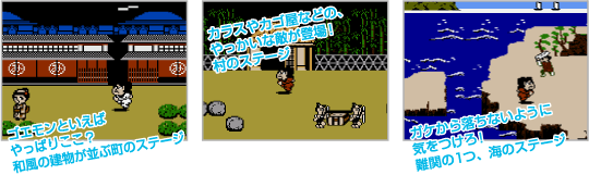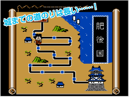 | このゲームでは、町や村、海、山などいくつものステージをクリアして、悪大名のいる城をめざします。ステージの数は100以上! 襲ってくる敵たちを倒しつつ通行手形を集めて関所を通り、次のステージへ向かいましょう。完全クリアまでの道のりはかなり険しいですが、やりごたえは充分です。 | ![]() |