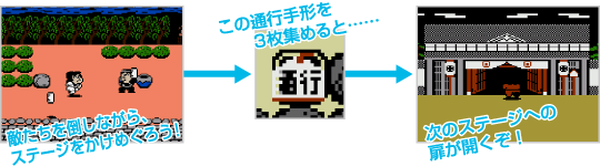 「通行手形」を3枚集めると、ステージ内のどこかにある「関所」の扉が開き、そこから次のステージに進めるようになります。すべてのステージを突破して、悪大名にいる城に攻め込みましょう。 ※