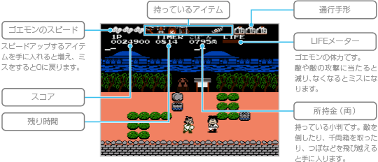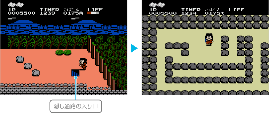 ステージの地下にはいくつもの隠し通路があり、中に入ると通行手形や千両箱などのアイテムを拾うことができたり、別の場所に出ることができます。隠し通路の入り口は、ジャンプで上を飛び越えると現れるので探してみましょう。また、アイテム「ろうそく」を持っていると、隠し通路の入り口が見えるようになります。 ![]() |