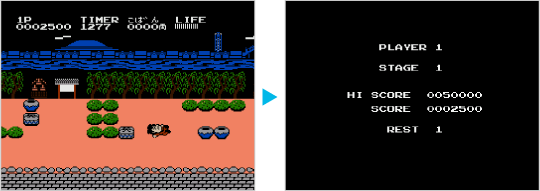 ゴエモンのLIFEメーターまたは残り時間がなくなったり、ガケから落ちたりするとミスとなって残り数(REST)が1人減ります。残り数が0のときにミスをするとゲームオーバーとなり、最初からやり直しとなります。