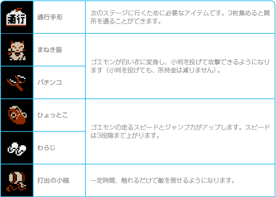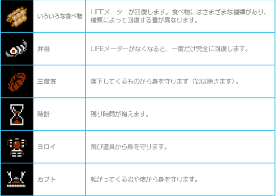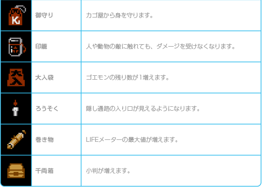 アイテムはお店で買ったり、玉手箱の中や隠し通路内などで拾えるほか、特定の場所でジャンプをすると現れることがあります。