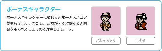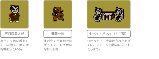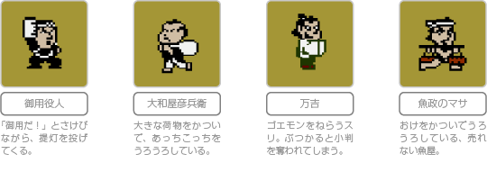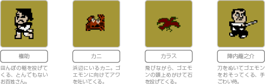 ゴエモンの道中に登場する、敵キャラクターの一部を紹介します。敵キャラクターを倒すと、小判と得点が手に入ります。