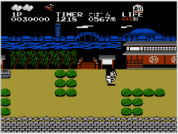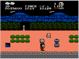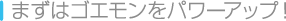 | ステージが始まったら、まずは玉手箱の上をジャンプして、ひょっとこやまねき猫などのアイテムを取りましょう。ゴエモンの移動スピードが上がったり、小判で遠くを攻撃できるようになると、敵との戦いがぐっと楽になるはずです。 ただし、ダメージを受けてLIFEメーターが減ってしまうと、小判を投げる能力を失ってしまうので気をつけましょう。 |