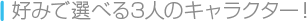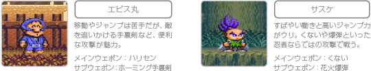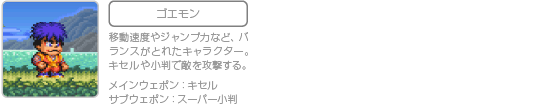 操作できるキャラクターは、「ゴエモン」「エビス丸」「サスケ」の3人で、それぞれ特徴や使う武器が異なります。また、各キャラクターは「メインウェポン」と「サブウェポン」という2種類の武器を使い分けることができます。自分のプレイスタイルに合わせて使うキャラクターを選びましょう。 ![]() ![]() |
