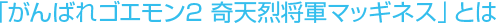 『がんばれゴエモン2 奇天烈将軍マッギネス』は、1993年12月22日にスーパーファミコン用のソフトとして発売されました。ゴエモンとその仲間たちの愉快な珍道中を楽しんでください。 物語は南の楽園「琉球リゾート」から始まります。消えた大江戸城を探して日本全国を旅しましょう。道中にはゴエモンたちに勝るとも劣らぬ個性的な敵(からくりメカ)が登場します。ゴエモンやエビス丸、サスケといったキャラクターを操作して、倒しながら進んでください。 ![]() |