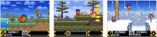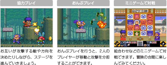 2人プレイで遊べば、力を合わせて敵を攻撃したり、おんぶプレイで移動と攻撃の操作を分担しながらステージを進むことができます。また、町ステージの遊戯場では、ミニゲームで対戦を楽しむこともできます。 ![]() |