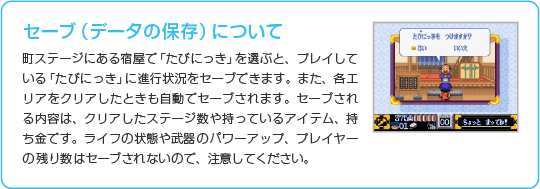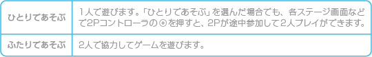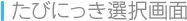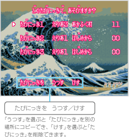 「たびにっき」とは、ゲームの進行状況を保存するセーブデータのことです。最初から遊ぶ場合は「はじめから」と表示された「たびにっき」を選び、キャラクターセレクト画面に進んでください。 すでに「たびにっき」がある場合は、その「たびにっき」を選ぶとキャラクターセレクトを行ったあと、続きからゲームを再開できます。 |
