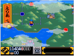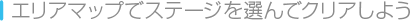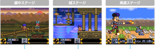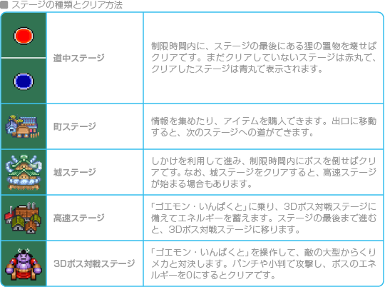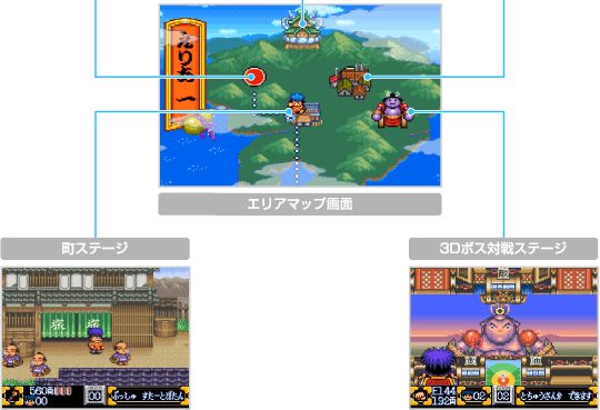 | ゴエモンたちが旅をする日本はいくつかのエリアに分かれており、1つのエリアには複数のステージがあります。エリアマップ画面で遊ぶステージを選んでクリアをめざしましょう。ステージをクリアすると次のステージへの道ができ、城ステージや3Dボス対戦ステージをクリアすると、次のエリアに進めます。 | ![]() |