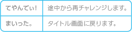 ゲームオーバーになると以下のメニューが表示され、「てやんでぃ!」を選ぶと、ゲームオーバーになったところから再開できます。ただし、再開した場合は、手に入れたアイテムは残りますが、持ち金は半分になり、ライフは初期状態に戻ってしまいます。 ![]() |