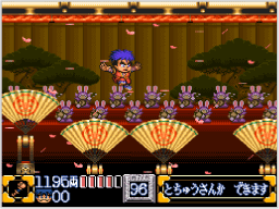 ゴエモンたちを操作して敵を倒しながら進み、制限時間内にステージの最後にある狸の置物を壊しましょう。敵を倒すと、買い物などに使う小判や、武器がパワーアップする「招き猫」が出現することがあり、触れると取ることができます。 ![]() |