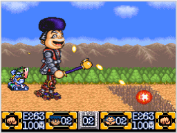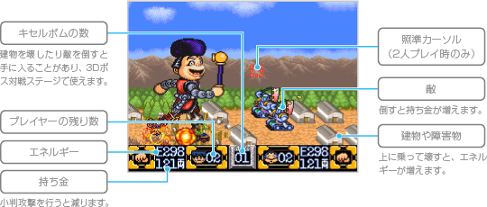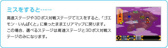 大型からくりメカ「ゴエモン・いんぱくと」に乗って進んでいく、横スクロールのステージです。ステージが始まると「ゴエモン・いんぱくと」のエネルギーが徐々に減っていき、穴に落ちたり障害物にはさまれてしまうと大きく減ります。建物や障害物などを壊してエネルギーを回復しましょう。ステージの最後まで進むとクリアになり、3Dボス対戦ステージに移ります。 なお、途中でエネルギーがなくなってしまうとミスになり、エリアマップ画面に戻ります。 ![]() |