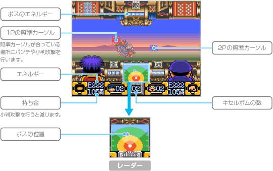 ボスとの距離に応じて攻撃方法を変えてください。ボスの攻撃はガードしたり、こちらの攻撃を当てて防ぎましょう。なお、2人プレイ中は各プレイヤーの照準カーソルが表示され、攻撃やガードを分担して操作できます。ただし、同じタイミングで同じ操作を行った場合は、何も起こりません(小判攻撃のみ同時に行えます)。 ![]() |
