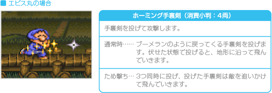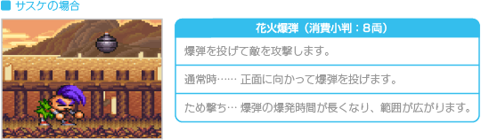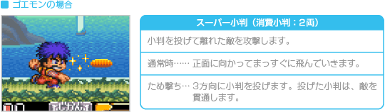 持ち金を消費して、上方向や横方向に武器を発射します。なお、 ※小判の消費量は、通常時もため撃ち攻撃時も同じです。 |