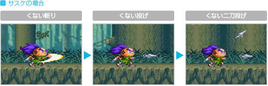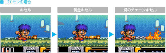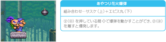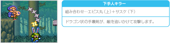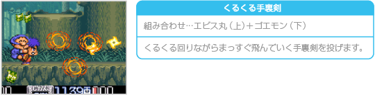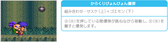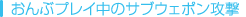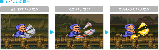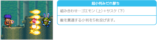 おんぶプレイ中にサブウェポン攻撃を行うと、通常時とは違った種類の攻撃ができます。ため撃ち攻撃はできませんが、どれも威力が高く特殊な効果を持っています。なお、おんぶプレイ中のサブウェポン攻撃では、上に乗ったキャラクターが小判を6両消費します。 ![]() ![]() ![]() ![]() ![]() ![]() |