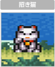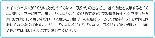 基本となる攻撃方法です。敵を倒したときに出現することのある「招き猫」を取ると武器がパワーアップし、威力が上がったり攻撃範囲が広くなります(最大2段階)。ダメージを受けると逆に1段階パワーダウンします。 |