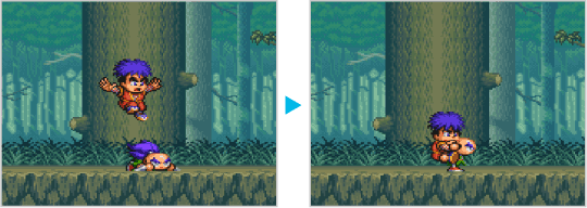 2人で遊んでいる場合はおんぶプレイができます。一方のプレイヤーが伏せたら、もう一方はその上にジャンプしておんぶ状態になりましょう。おんぶプレイ時は、上のプレイヤーが攻撃を、下のプレイヤーが移動を担当します。おんぶプレイをやめるときは、上のプレイヤーがジャンプしてください。なお、おんぶプレイ中にダメージを受けると両方のプレイヤーのライフが減ります。 ![]() |