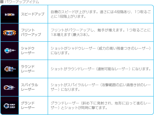 最新鋭戦闘機「フリントロック」を操作して進み、最後に出てくるボスを倒すとクリアです。自機についているフリント(触手の生えた謎の生命体)を脱着したり、敵を倒すと出現するパワーアップアイテムを利用して進んでいきましょう。敵や敵の攻撃、障害物に当たるとミスになります。