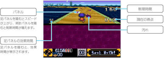 制限時間内にできるだけ多くの汚れをふき取るミニゲームです。ゴエモンたちを操作して汚れのある場所を通るとふき取ることができ、パネルのある場所を通るとスピードが上がったり、制限時間が増えます。穴や廊下の端から落ちるとタイムロスになるので注意しましょう。ふき取った汚れの数が得点になります。