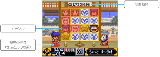 裏向きに置いてあるパネルを2枚めくり、表に描かれた絵を合わせるミニゲームです。お互いに競い合ってすばやくめくってください。パネルは同時に2枚までめくることができ、めくったパネルの絵が同じ場合は得点が入ります。すべてのパネルの絵がそろった場合や、制限時間になるとゲームが終了し、得点に応じて小判が手に入ります。