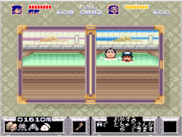 迷路や見世物小屋から、占い、競馬にいたるまで、町の中にはいろいろなレジャー施設が用意されています。しかもただ遊べるだけでなく、アイテムを獲得できたり小判を稼げたりするものも多くあり、ゴエモンたちの旅には欠かせません。なかでも重要なのが、ライフゲージを回復する施設です。宿に泊まるか温泉に浸かるかなど、本当に旅をしているときのように、そのときの気分で選べます。 |