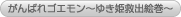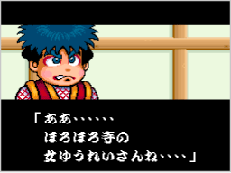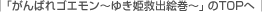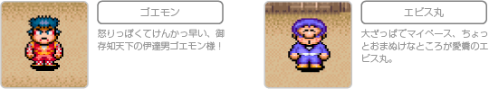 いつの間にやら近所に住みついた、自称「忍者」のエビス丸も、今ではすっかりはぐれ町の住人である。 このところ、北のはずれのほろほろ寺に、美人の幽霊が出るという噂があった。 ある日のこと。 「ゴエモンはん、知ってはりまっか!」 とエビス丸が駆け込んできた。 「なんでぃ! やぶからぼうに!」 「噂のべっぴんはんのことなんでっけど。」 「ああ、ほろほろ寺の女幽霊さんね……。」 「そーでんがな! そのべっぴんはんにちょっかいを出そうとしたもんが、イタイ目におうたっちゅうて……。」 「てやんでぃ! 幽霊の分際で人間様をイタイ目にあわせるたぁふてえ野郎だ!」 「ここはひとつ、 わてのこのプレイボーイぶりで……。」 「ごちゃごちゃ言ってる暇はねぇ! いくぜエビス丸。」 やにわにキセルを手にして飛び出すゴエモン。 「あっ、わてまだ頭のセットが……。」 後を追うエビス丸。 こうしてまた、三度目の旅が始まろうとは、二人には思いもよらないことであった。 幽霊見たさにのこのこ出かけた ゴエモンとエビス丸。 困っている人を見たらほおっちゃおけねぇ! 根っからの江戸っ子気質も手伝って、大江戸城のゆき姫失踪事件に巻き込まれるハメに! はたしてゆき姫様はどこに? 行く手を阻む謎のお面軍団とは? さあ! 日本全国をまたにかけゴエモン&エビス丸コンビが大活躍する旅の始まり! 始まり〜! |