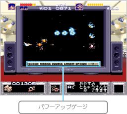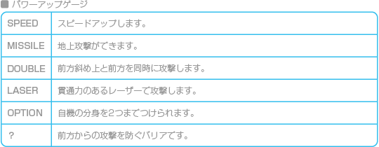 自機ビックバイパーを操縦し、敵を倒しながら進んでください。ステージの最後に登場するビッグコアを倒すとクリアです。 特定の敵や編隊を倒すとカプセルが現れ、取った数によってパワーアップゲージが光ります。使いたいパワーアップ名が点灯しているときに |