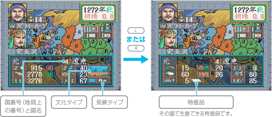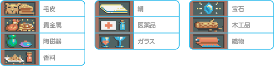 特産品には以下の10種類があります。何を生産できるかは、国によって異なります。 ![]() |