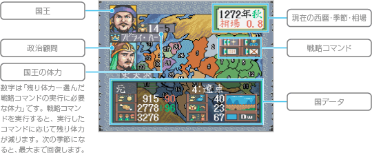 戦略画面はゲームの中心となる画面です。戦略コマンドを駆使して、さまざまな行動をとってください。 |