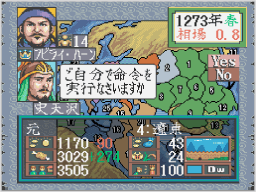 政治顧問がいる場合は季節のはじめに右のような画面になり、自分で戦略コマンドを実行するかどうか選べます。「No」を選ぶと、政治顧問に戦略コマンドの実行を任せることができます。 |