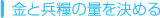 戦争を始めるときは、まず軍団の編成を行います。続いて金(軍資金)と兵糧をどれくらい持っていくのかを決めてください。