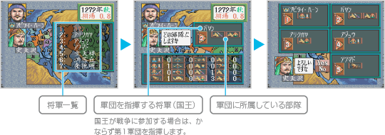 軍団は指揮をする将軍(国王)1人と部隊(最大4部隊まで)で構成されます。第1軍団の将軍(国王)は軍団司令官(全軍のリーダー)になります。軍団は最大で5つまで作成でき、戦争中は軍団ごとに行動します。指揮をする将軍と軍団の部隊をそれぞれ選んでください。編成が終わると確認画面になるので、「Yes」を選んでください。 ![]() |