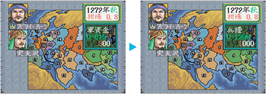 戦争に持って行く金と兵糧をそれぞれ決めてください。兵糧は戦争に参加している部隊数に応じて配分され、補給率が決定します。戦争を仕掛けられた場合は、軍団に持たせる兵糧のみ決めてください。