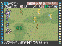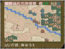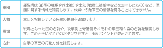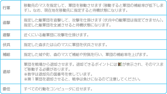| 行軍画面では、行軍コマンドを選んで軍団に命令を出していきます。行軍コマンドには、「指示」「編成」「交渉」「情報」の4種類があります。 | ![]() |