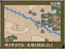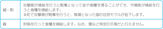 「補給」を選ぶと城や町、森のマスで物資を補給し、軍団の補給率を上げられます。行うマスによって以下のような違いがあります。 |