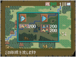 攻撃側と守備側の軍団が隣接したときに、どちらか(または両方)の軍団が「追撃」や「遊撃」を選んでいると、戦闘画面に移って両軍団の戦闘が始まります。 |
