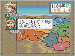 戦略画面では、他国同士で戦争を行う場合などにメッセージが表示されます。戦争後の国は兵糧などの物資や、部隊数が少ないことがあるので、戦争を仕掛ける絶好のチャンスです。メッセージはしっかりと確認するようにしてください。 |