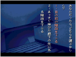 | 怖い話の途中にはいくつかの分岐点が現れ、どの選択肢を選ぶかによって物語が大きく変わることもあります。また、状況によっては主人公の身に思いもよらないことが起こることもあるので、選択肢は慎重に選んでください。 | ![]() |
