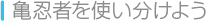 亀忍者は固有の武器のほかに、武器アイテムを使うことができます。「シュリケン」や「ブーメラン」など、遠方の敵を攻撃できるものが多いので、固定の武器とうまく組み合わせて使ってください。なお、武器アイテムは1種類のみ持つことができ、新たな武器アイテムを取ると前の武器アイテムはなくなってしまいます。 |