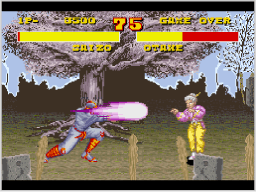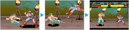 キャラクターが画面端で吹き飛ばされると、端にある柵やドラム缶などが壊れ、ステージが左右に広がることがあります。相手に吹き飛ばされたときは、間合いが広がって体勢を整え直すチャンスになります。 ![]() |