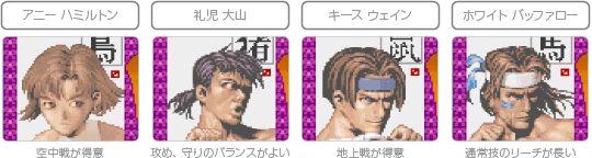 大会に参加するのは、かつての剣豪「野牛十兵衛」の血を引くものたち。それぞれ「空中戦が得意」「通常技のリーチが長い」といった特徴があり、必殺技が異なります。選んだキャラクターの得意分野を活かして戦うことが勝利へのカギです。 ![]() ![]() |