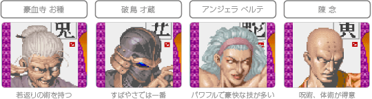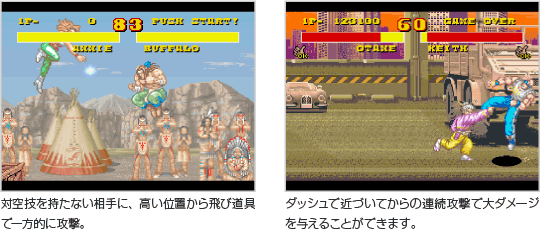 『豪血寺一族』では、すべてのキャラクターが二段ジャンプとダッシュを使うことができます。相手の攻撃が届かない高さから必殺技を繰り出したり、ダッシュで近づいて攻撃を決めたりするなど、高さと速さを活かして戦うことが重要です。 ![]() |