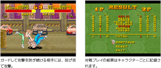 コントローラが2つあると2人対戦プレイができます。対戦プレイでは、人対人ならではの「いつ必殺技を使うか」「ガードしている相手をどう攻撃するか」などの駆け引きを繰り広げることができます。 ![]() |