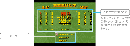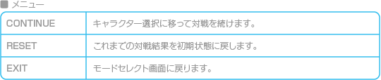コンピュータが動く、1人プレイ専用の練習モードです。自分と相手のキャラクター、難易度、ステージを選ぶと練習開始です。 ※体力メーターがなくなっても対戦は終わりません。