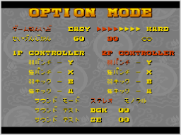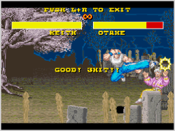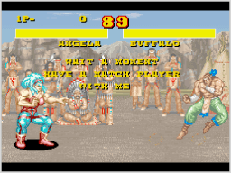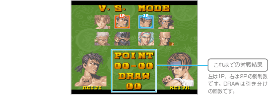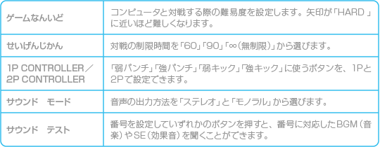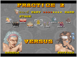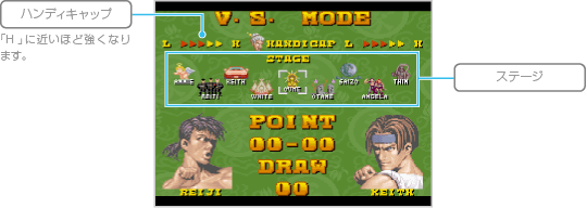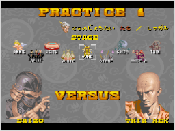 コンピュータが動かない、1人プレイ専用の練習モードです。自分と相手のキャラクター、相手の状態(「たち」か「しゃがみ」)、ステージを選ぶと練習開始です。 ※コンピュータがガードし続けているときは、一定距離離れるとガードを解きま