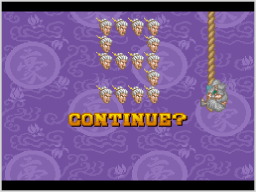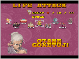 1人プレイ専用で、体力メーターがなくなるまでに何人倒せるかを競います。自分のキャラクター、対戦人数とステージを決めると対戦開始です。 試合に負けるか、対戦人数を「8」「16」に設定したときはその人数を勝ち抜くと終了です。対戦人数が「∞」のときは、試合に負けるまで戦い続けることができます。 |